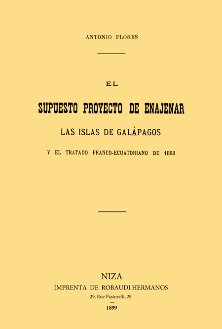 Flores, Antonio. 1899. El Supuesto proyecto de enajenar las Islas de Galápagos y el tratado franco - ecuatoriano de 1888. Niza, Francia : Imprenta de Robaudi Hermanos.