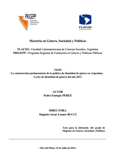Pérez, Pedro Enrique (2016). La construcción parlamentaria de la política de identidad de género en Argentina : la ley de identidad de género del año 2012. Tesis de Maestría. FLACSO. Sede Académica Argentina, Buenos Aires.