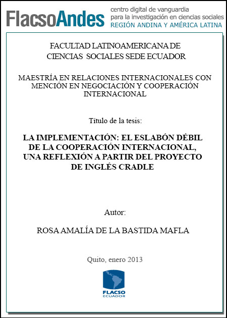 Bastida, R. A. (2013). El eslabón débil de la cooperación internacional, una reflexión a partir del proyecto de inglés cradle (Tesis de Maestría en Relaciones Internacionales con mención en Negociación y Cooperación Internacional). FLACSO Sede Ecuador, Quito.