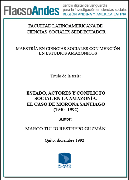 Restrepo Guzmán, Marco Tulio (1992). Estado, actores y conflicto social en la Amazonía: el caso de Morona Santiago (1940-1992). Maestría en Ciencias Sociales con mención en Estudios Amazónicos; FLACSO - Sede Ecuador. Quito. 127 p.