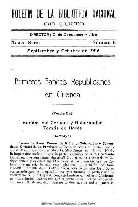 Gangotena y Jijón, Cristobal. 1926. Boletín de la Biblioteca Nacional de Quito. V1. N6. Quito. Talleres Tipográficos Nacionales. 53 p.