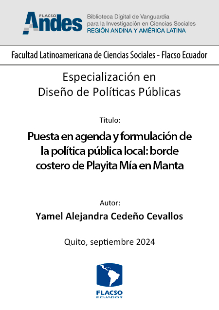 Cedeño Cevallos, Yamel Alejandra. 2024. Puesta en agenda y formulación de la política pública local : borde costero de Playita Mía en Manta. Tesina de especialización, Flacso Ecuador.