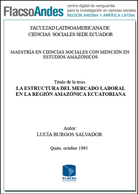 Burgos Salvador, Lucía La estructura del mercado laboral en la región Amazónica ecuatoriana. Quito FLACSO - Sede Ecuador 1995 138 p., tablas Tesis : Maestría en Ciencias Sociales con mención en Estudios Amazónicos. FLACS0 Bibliografía: p. 133-138