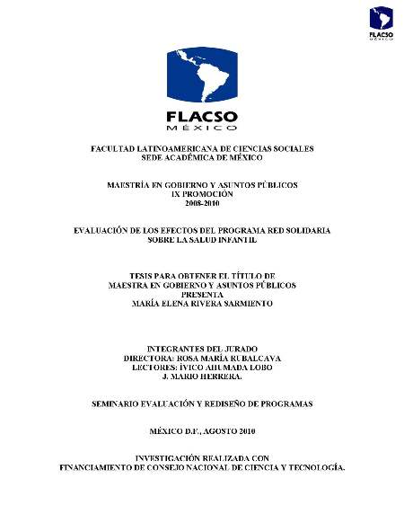 Rivera Sarmiento, María Elena (2010). Evaluación de los efectos del Programa Red Solidaria sobre la salud infantil. Maestría en Gobierno y Asuntos Públicos; FLACSO México. México. 127 h.