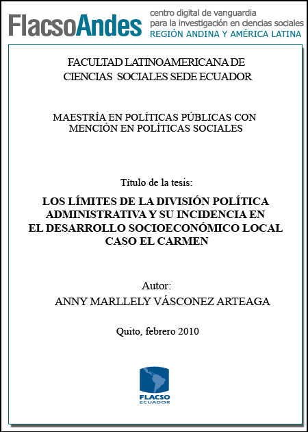 Vásconez Arteaga, Anny Marllely (2010). Los límites de la división política administrativa y su incidencia en el desarrollo socioeconómico local - caso El Carmen. Maestría en Políticas Públicas con mención en Políticas Sociales; FLACSO sede Ecuador. El Carmen. 128 p.