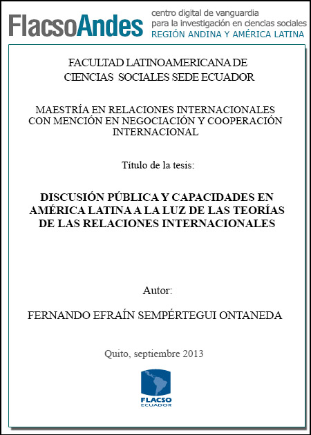 Sempértegui, F. E. (2013). Discusión pública y capacidades en América Latina a la luz de las teorías de las relaciones internacionales (Tesis de Maestría en Relaciones Internacionales con mención en Negociación y Cooperación Internacional). FLACSO Sede Ecuador, Quito.