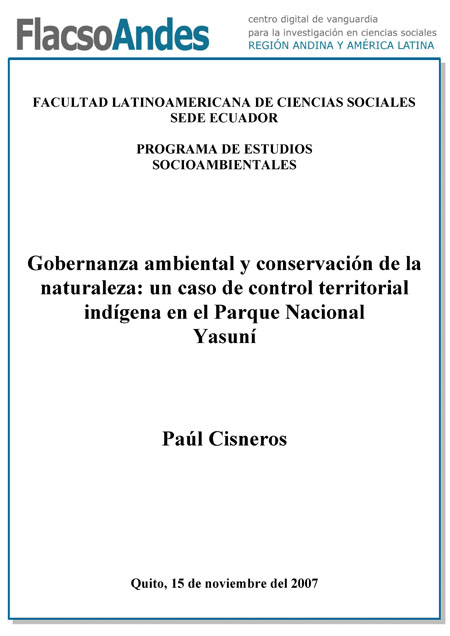 Cisneros Paúl (2007). Gobernanza ambiental y conservación de la naturaleza un caso de control territorial indígena en el Parque Nacional Yasuní. Programa de Estudios Socioambientales; FLACSO-Sede Ecuador. Quito. 143 p.