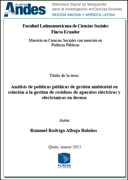 Albuja Bolaños, Rommel Rodrigo. 2015. Análisis de políticas públicas de gestión ambiental en relación a la gestión de residuos de aparatos eléctricos y electrónicos en desuso. Tesis de maestría, Flacso Ecuador.