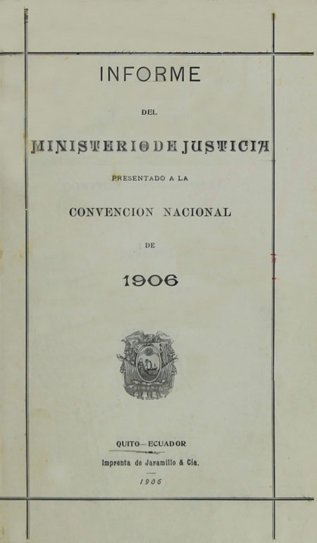 Ministerio de Justicia. 1906. Informe del Ministerio de Justicia presentado a la Convención Nacional de 1906. Quito, Ecuador : Imprenta de Jaramillo & Cía.