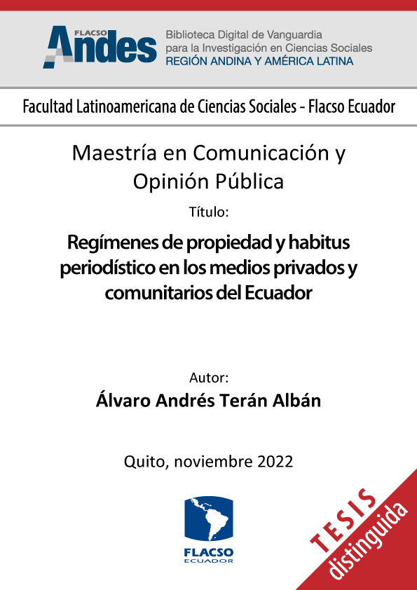 Terán Albán, Álvaro Andrés. 2022. Regímenes de propiedad y habitus periodístico en los medios privados y comunitarios del Ecuador. Tesis de maestría, Flacso Ecuador.