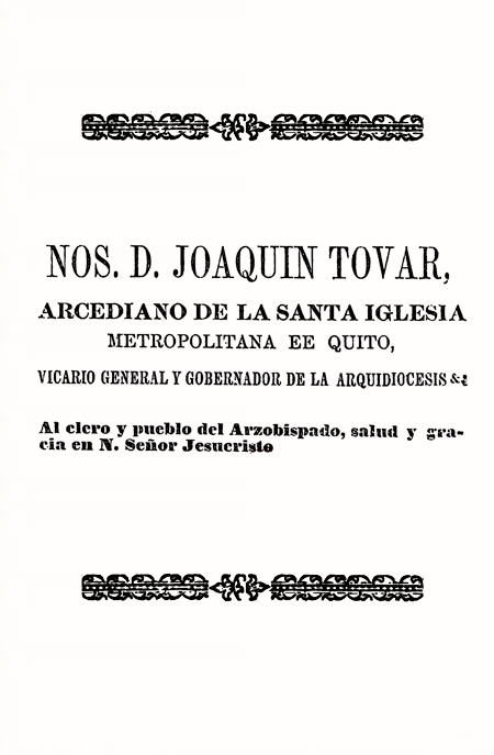 Tovar, Joaquín. 1871. Nos de Joaquín Tovar, Arcediano de la Santa Iglesia Metropolitana de Quito, Vicario General y Gobernador de la Arquidiócesis. [ Quito, Ecuador ] : Imprenta de Juan Campuzano.