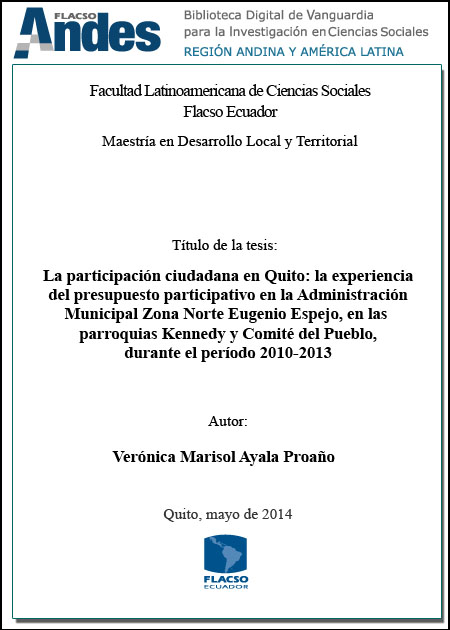 Ayala Proaño, Verónica Marisol. 2014. La participación ciudadana en Quito: la experiencia del presupuesto participativo en la Administración Municipal Zona Norte Eugenio Espejo, en las parroquias Kennedy y Comité del Pueblo, durante el período 2010-2013. Tesis de maestría, Flacso Ecuador.