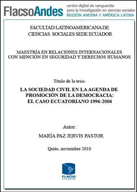 Jervis Pastor, María Paz (2010). La sociedad civil en la agenda de promoción de la democracia : el caso ecuatoriano 1996-2006. Maestría en Relaciones Internacionales con mención en Seguridad y Derechos Humanos; FLACSO Sede Ecuador. Quito. 86 p.