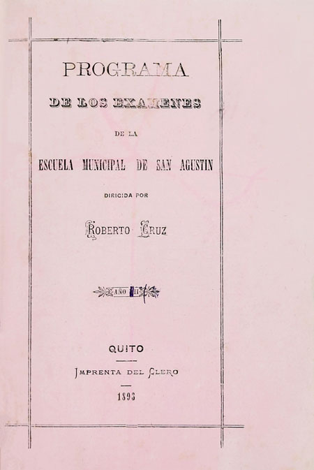 Cruz, Roberto y Escuela Municipal de San Agustín. 1893. Programa de los exámenes de la Escuela Municipal de San Agustín. Quito, Ecuador: Imprenta del Clero.