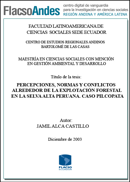 Alca Castillo, Jamil (2003). Percepciones, normas y conflictos alrededor de la explotación forestal en la selva alta peruana. Caso Pilcopata. Maestría en Ciencias Sociales con mención en Gestión Ambiental y Desarrollo. FLACSO, Sede Ecuador : Colegio Andino. Centro de Estudios Regionales Andinos Bartolomé de las. Lima, Perú. 123 p.