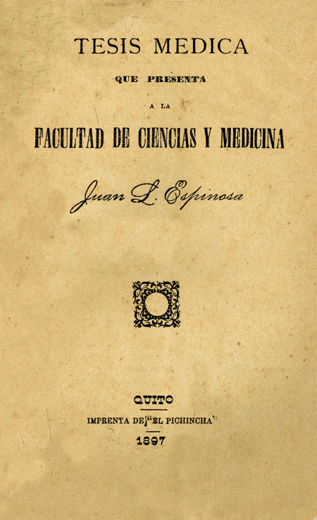 Espinosa, Juan L. 1897. Tesis médica que presenta a la Facultad de Ciencias y Medicina. Quito, Ecuador : Imprenta "El Pichincha".