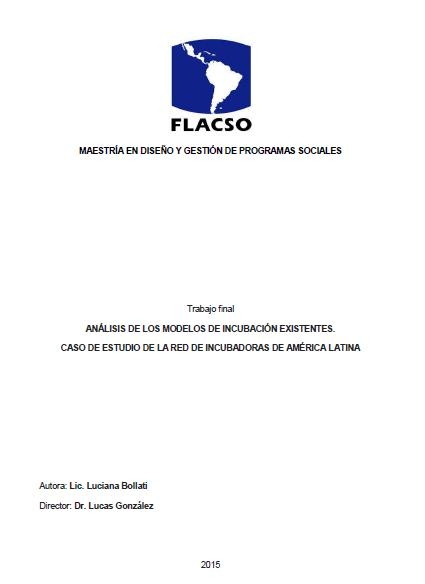 Bollati, Luciana Melisa (2015). Análisis de los modelos de incubación existentes : caso de estudio de la Red de Incubadoras de América Latina. Tesis de Maestría. FLACSO. Sede Académica Argentina, Buenos Aires.