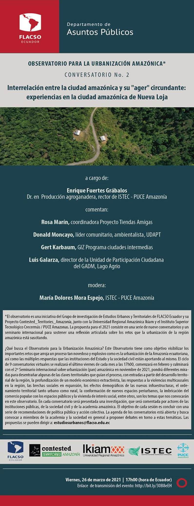 FLACSO Ecuador : Políticas Públicas – Observatorio para la urbanización amazónica Conversatorio No. 2, 26 de marzo de 2021 - 17:00 – 18:30 - FLACSO Ecuador, Quito. Un evento organizado por el observatorio; una iniciativa de Grupo de investigación de Estudios Urbanos y Territoriales de FLACSO Ecuador y su Proyecto Contested_Territories_Amazónica, junto con la universidad Regional Amazónica Ikiam y el Instituto Superior Tecnológico Crecemás/PUCE Amazonas. La propuesta para el 2021 consiste en una serie de nueva conversatorios y un seminario internacional para sostener una reflexión articulada sobre los retos que la urbanización de la región amazónica está suscitando.