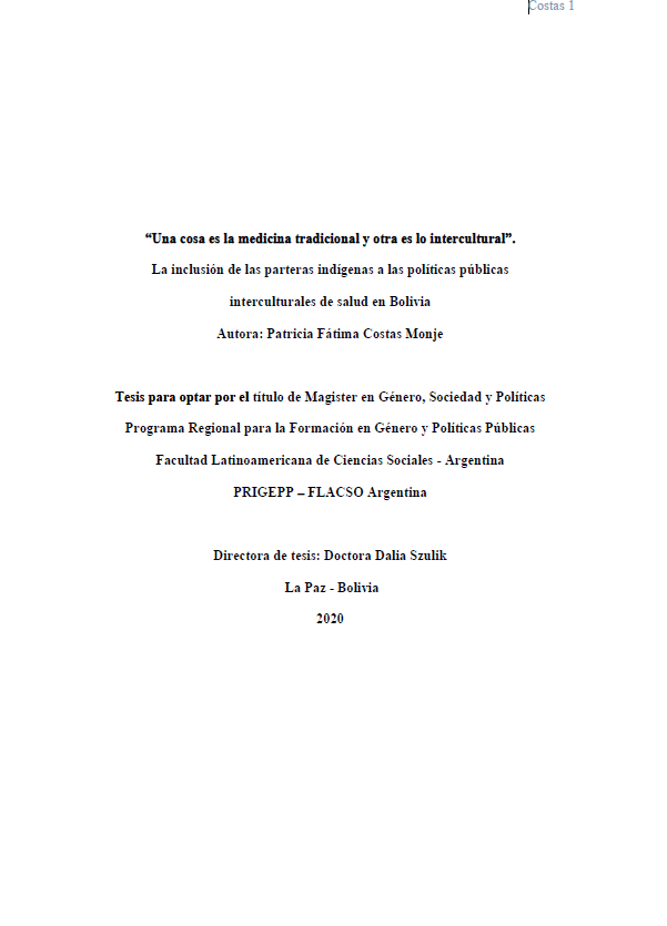 Costas Monje, Patricia Fátima. (2020). “Una cosa es la medicina tradicional y otra es lo intercultural” : la inclusión de las parteras indígenas a las políticas públicas interculturales de salud en Bolivia. Tesis de Maestría. FLACSO. Sede Académica Argentina, Buenos Aires.
