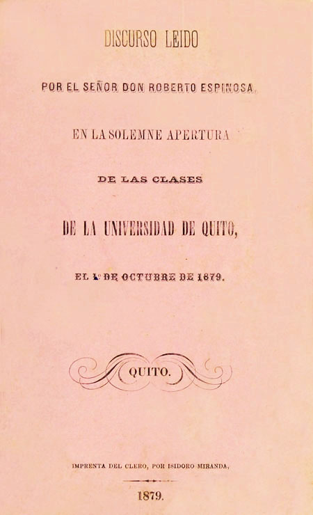 Espinosa, Roberto. 1879. Discurso leído por el Señor Don Roberto Espinosa en la solemne apertura de las clases de la Universidad de Quito, el 1° de Octubre de 1879. Quito, Ecuador : Imprenta del Clero.