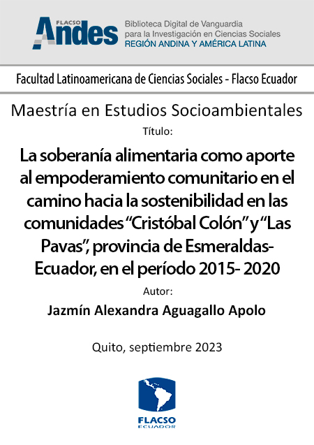 Aguagallo Apolo, Jazmín Alexandra. 2023. La soberanía alimentaria como aporte al empoderamiento comunitario en el camino hacia la sostenibilidad en las comunidades “Cristóbal Colón” y “Las Pavas”, provincia de Esmeraldas- Ecuador, en el período 2015- 2020. Tesis de maestría, Flacso Ecuador.