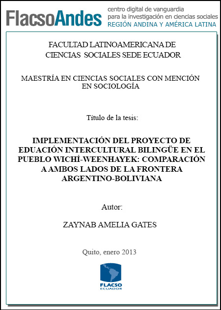 Gates, Z. A. (2013). Implementación del proyecto de educación intercultural bilingüe en el pueblo Wichí-Weenhayek : comparación a ambos lados de la frontera argentino-boliviana (Tesis de Maestría en Ciencias Sociales con mención en Sociología). FLACSO Sede Ecuador, Quito.
