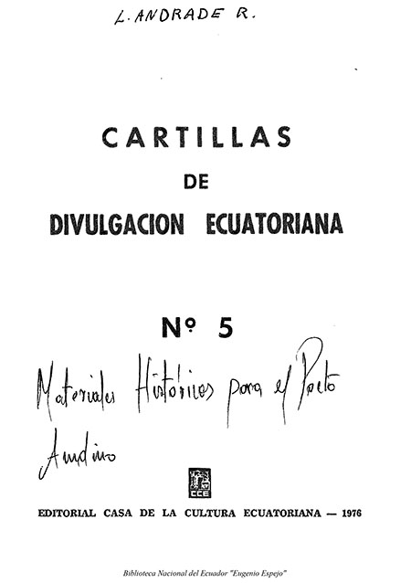 Andrade, Luis. 1976.Cartilla de divulgación ecuatoriana No. 5. Materiales históricos para el Pacto Andino. Quito, Ecuador : Casa de la Cultura Ecuatoriana.