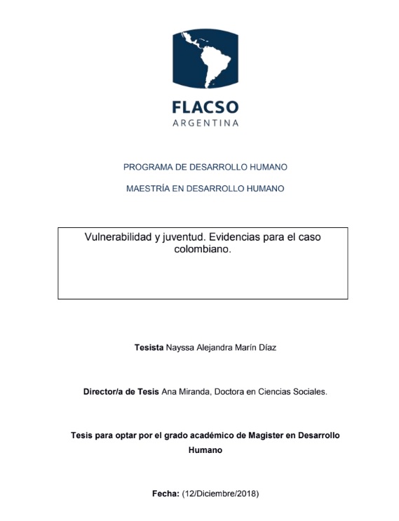 Marín Díaz, Nayssa Alejandra (2019). Vulnerabilidad y juventud : evidencias para el caso colombiano. Tesis de Maestría. FLACSO. Sede Académica Argentina, Buenos Aires.