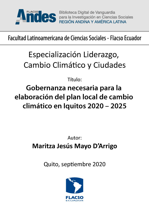 Mayo D’Arrigo, Maritza Jesús. 2020. Gobernanza necesaria para la elaboración del plan local de cambio climático en Iquitos 2020 – 2025. Tesina de especialización, Flacso Ecuador.