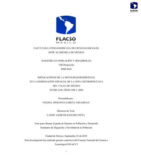 García Jaramillo, Yolima Apolonia (2010). Implicaciones de la movilidad residencial en la segregación espacial de la zona metropolitana del Valle de México entre los años 1990 y 2000. Maestría en Población y Desarrollo; FLACSO México. México. 161 h.