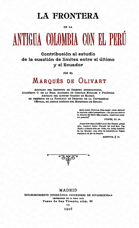 Marqués de Olivart. 1906. La frontera de la antigua Colombia con el Perú : Contribución al estudio de la cuestión de límites entre el último y el Ecuador. Madrid, España : Establecimiento Tipográfico << Sucesores de Rivadeneyra>> Impresores de la Real Casa.