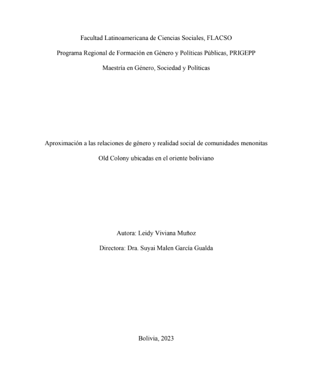 Muñoz, Leidy Viviana (2023). Aproximación a las relaciones de género y realidad social de comunidades menonitas Old Colony ubicadas en el oriente boliviano. Tesis de Maestría. FLACSO. Sede Académica Argentina, Buenos Aires.