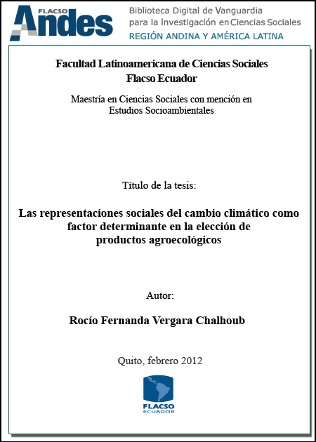 Vergara Chalhoub, Rocío Fernanda. 2012. Las representaciones sociales del cambio climático como factor determinante en la elección de productos agroecológicos. Tesis de maestría, Flacso Ecuador.