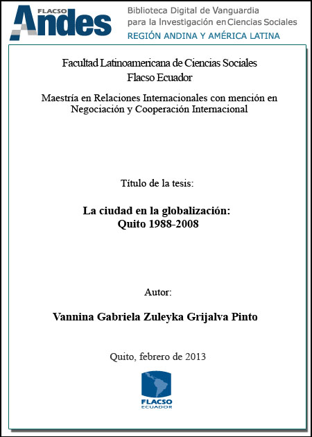 Grijalva Pinto, Vannina Gabriela Zuleyka. 2013. La ciudad en la globalización: Quito 1988-2008. Tesis de maestría, Flacso Ecuador.