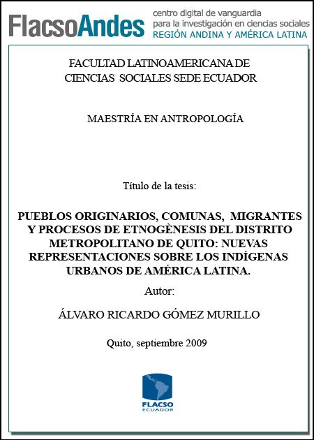 Gómez Murillo, Alvaro Ricardo (2009). Pueblos originarios, comunas, migrantes y procesos de etnogénesis del Distrito Metropolitano de Quito: nuevas representaciones sobre los indígenas urbanos de América Latina. Maestría en Antropología. FLACSO, Sede Ecuador. Quito. 112 p.