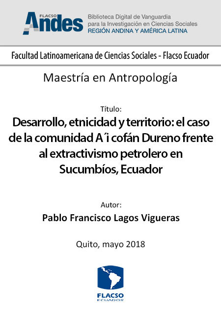 Lagos Vigueras, Pablo Francisco. 2018. Desarrollo, etnicidad y territorio: el caso de la comunidad A´i cofán Dureno frente al extractivismo petrolero en Sucumbíos, Ecuador. Tesis de maestría, Flacso Ecuador.