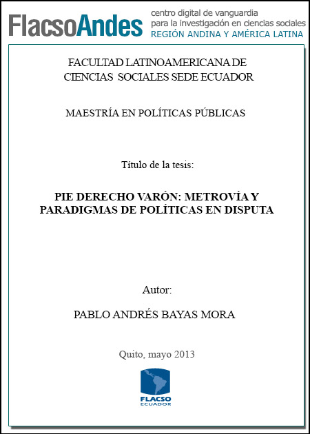 Bayas, P. A. (2013). Pie derecho varón : metrovía y paradigmas de políticas en disputa (Tesis de Maestría en Políticas Públicas). FLACSO Sede Ecuador, Quito.