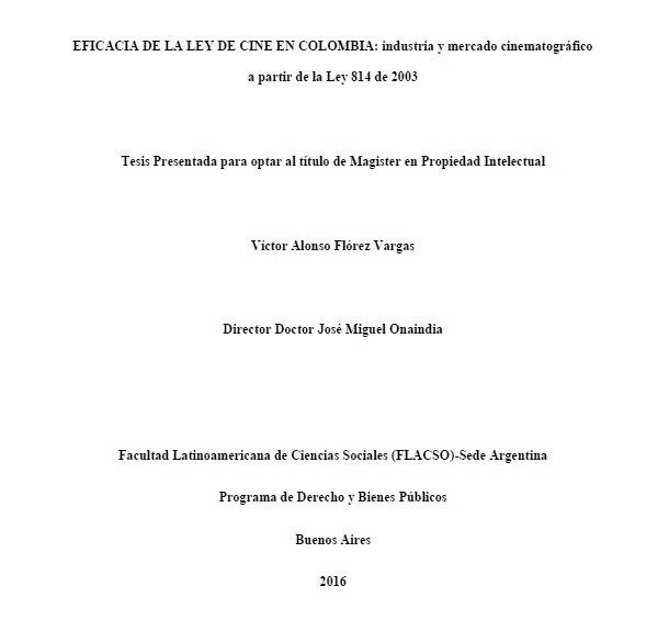 Flórez Vargas, Víctor Alonso (2016). Eficacia de la Ley de Cine en Colombia : industria y mercado cinematográfico a partir de la Ley 814 de 2003. Tesis de Maestría. FLACSO. Sede Académica Argentina, Buenos Aires.