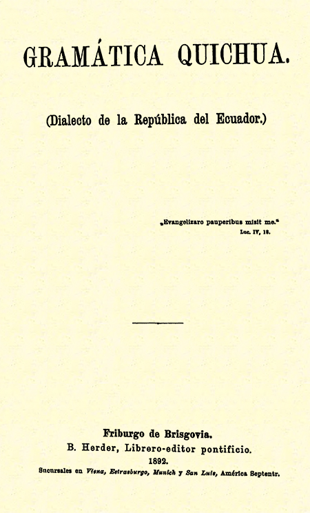1892. Gramática Quichua. ( Dialecto de la República del Ecuador). Friburgo de Brisgovia, Alemania : B. Herder, Librero- editor pontificio.