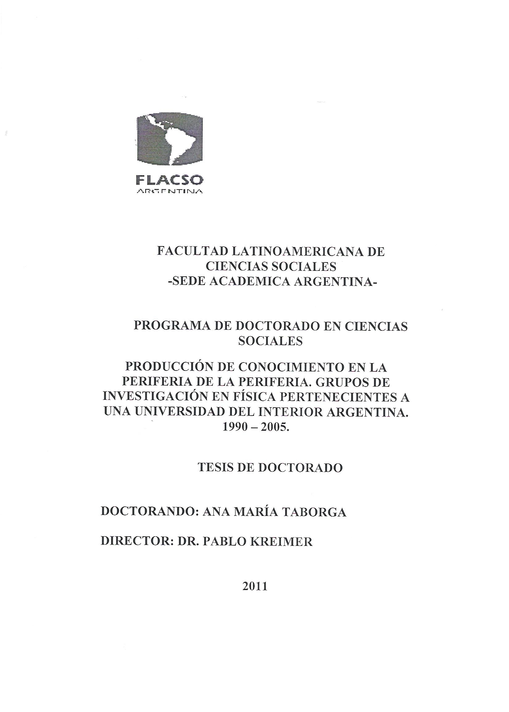 Taborga, Ana María (2011). Producción de conocimiento en la periferia : grupos de investigación en física pertenecientes a una universidad del interior argentina : 1990 - 2005. Tesis de Doctorado. FLACSO. Sede Académica Argentina, Buenos Aires.