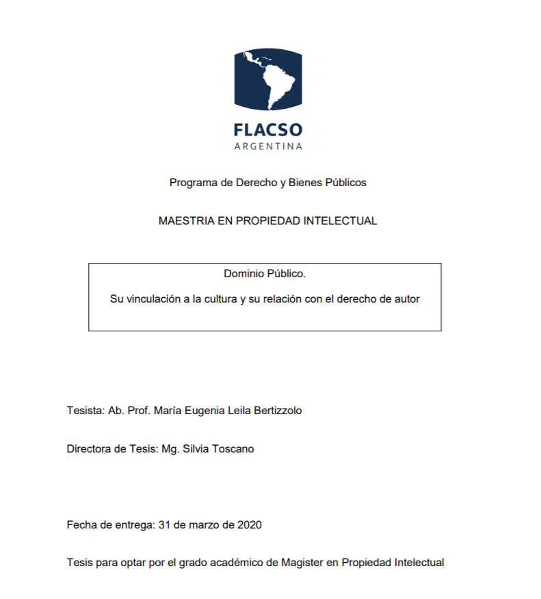 Bertizzollo, María Eugenia Leila. (2020). Dominio público : su vinculación a la cultura y su relación con el derecho de autor. Tesis de Maestría. FLACSO. Sede Académica Argentina, Buenos Aires.