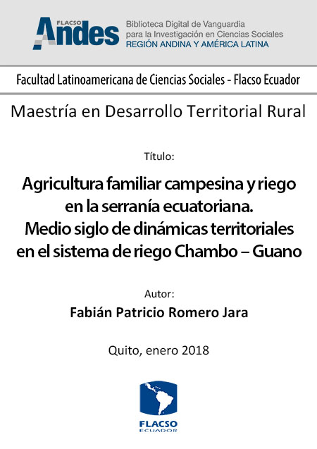 Romero Jara, Fabián Patricio. 2018. Agricultura familiar campesina y riego en la serranía ecuatoriana. Medio siglo de dinámicas territoriales en el sistema de riego Chambo – Guano. Tesis de maestría, Flacso Ecuador.