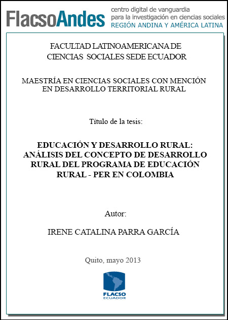 Parra, I. C. (2013). Educación y desarrollo rural : análisis del concepto de desarrollo rural del Programa de Educación Rural - PER en Colombia (Tesis de Maestría en Ciencias Sociales con mención en Desarrollo Territorial Rural). FLACSO Sede Ecuador, Quito.