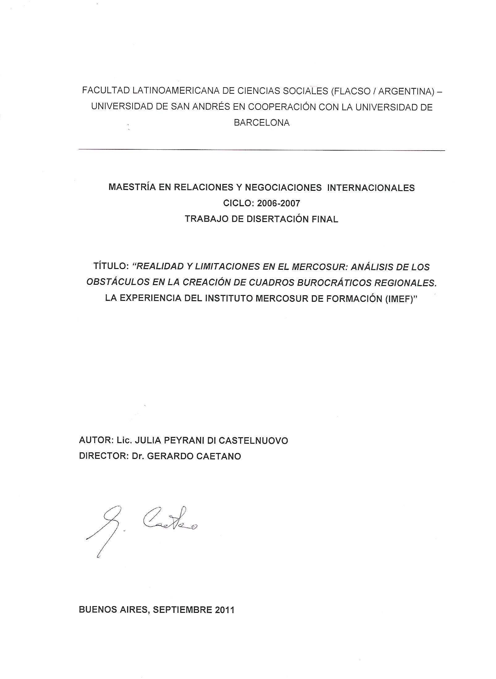 Peyrani di Castelnuovo, Julia (2011). Realidad y limitaciones en el Mercosur: análisis de los obstáculos en la creación de cuadros burocráticos regionales. La experiencia del Instituto Mercosur de Formación (IMEF). Tesis de Maestría. FLACSO. Sede Académica Argentina, Universidad de San Andrés en cooperación con la Universitat de Barcelona, Buenos Aires.