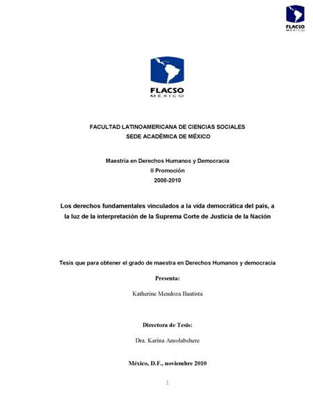 Mendoza Bautista, Katherine (2010). Los derechos fundamentales vinculados a la vida democrática del país, a la luz de la interpretación de la Suprema Corte de Justicia de la Nación. Maestría en Derechos Humanos y Democracia; FLACSO México. México. 142 h.