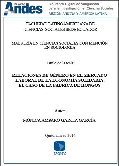 García García, Mónica Amparo. 2014. Relaciones de género en el mercado laboral de la economía solidaria: El caso de la fábrica de hongos. Tesis de maestría, FLACSO Sede Ecuador.