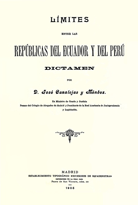 Canalejas y Méndez, José. 1905. Límites entre las repúblicas del Ecuador y del Perú : Dictamen. Madrid, España : Establecimiento Tipográfico << Sucesores de Rivadeneyra>> Impresores de la Real Casa.