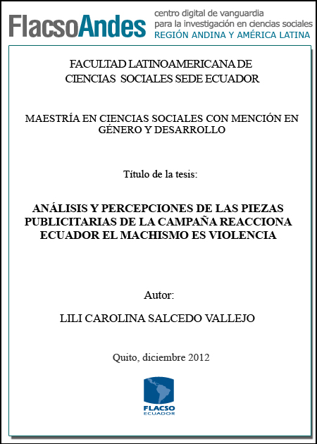 Salcedo Vallejo, Lili Carolina (2012). Análisis y percepciones de las piezas publicitarias de la campaña reacciona Ecuador el machismo es violencia. Maestría en Ciencias Sociales con mención en Género y Desarrollo, FLACSO Sede Ecuador. Quito, 109 p.