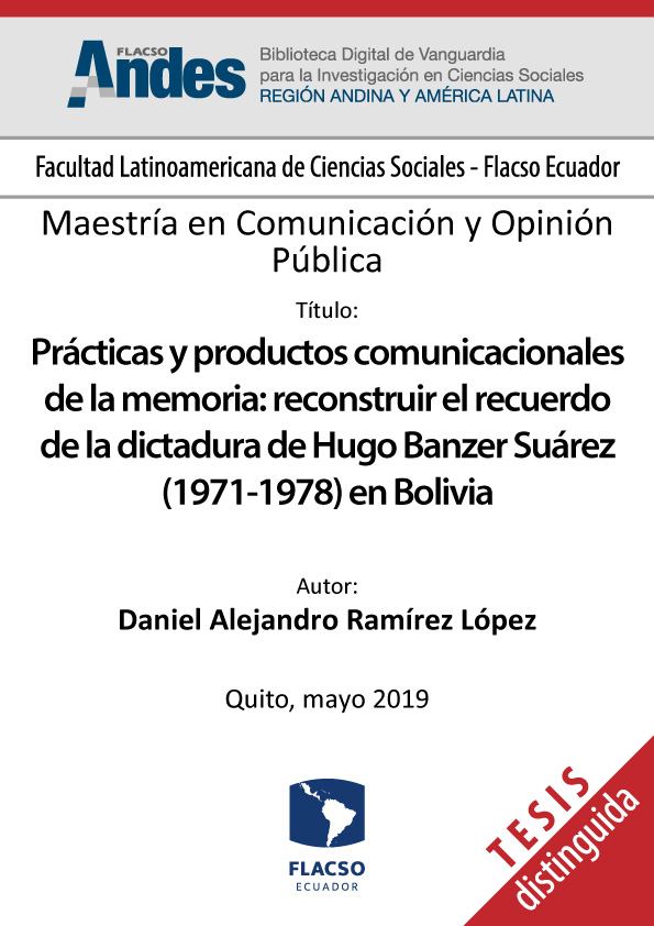 Ramírez López, Daniel Alejandro. 2019. Prácticas y productos comunicacionales de la memoria: reconstruir el recuerdo de la dictadura de Hugo Banzer Suárez (1971-1978) en Bolivia. Tesis de maestría, Flacso Ecuador.