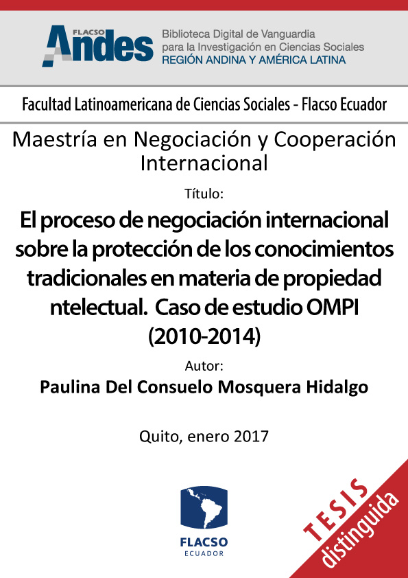Mosquera Hidalgo, Paulina Del Consuelo. 2017. El proceso de negociación internacional sobre la protección de los conocimientos tradicionales en materia de propiedad intelectual. Caso de estudio OMPI (2010-2014). Tesis de maestría, Flacso Ecuador.